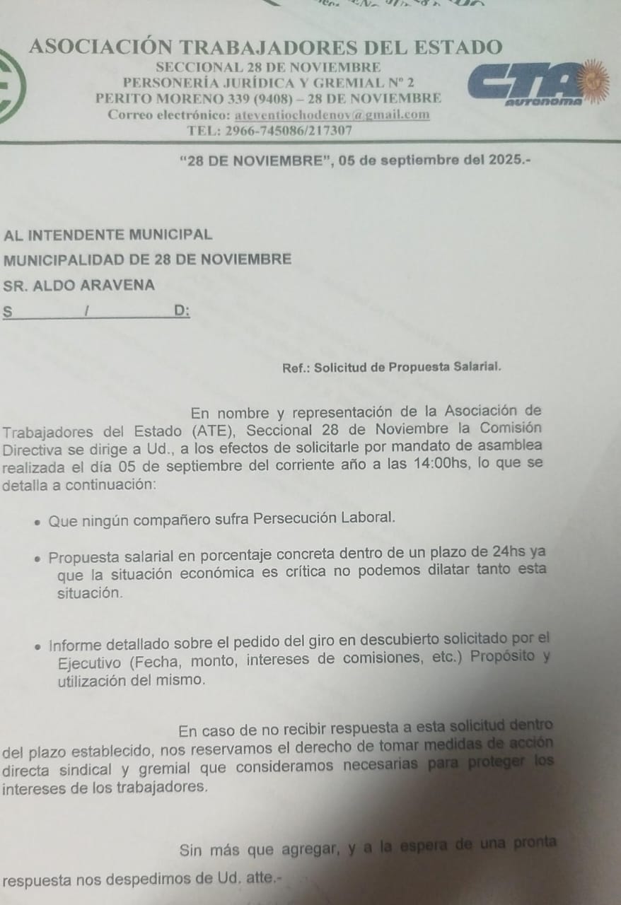 Añadió que este paro “es por la falta de respuesta a la solicitud de una propuesta salarial con respecto a la nota que enviamos del día 05 de septiembre, cuando informamos que de no tener respuesta iniciaremos medidas de acción directa”.